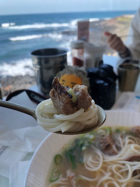 통유리창 안에서 해변을 바라보며 국수를 먹습니다.