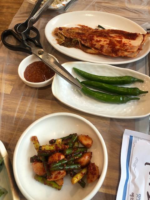 밑반찬으로는 김치, 고추, 마늘쫑
