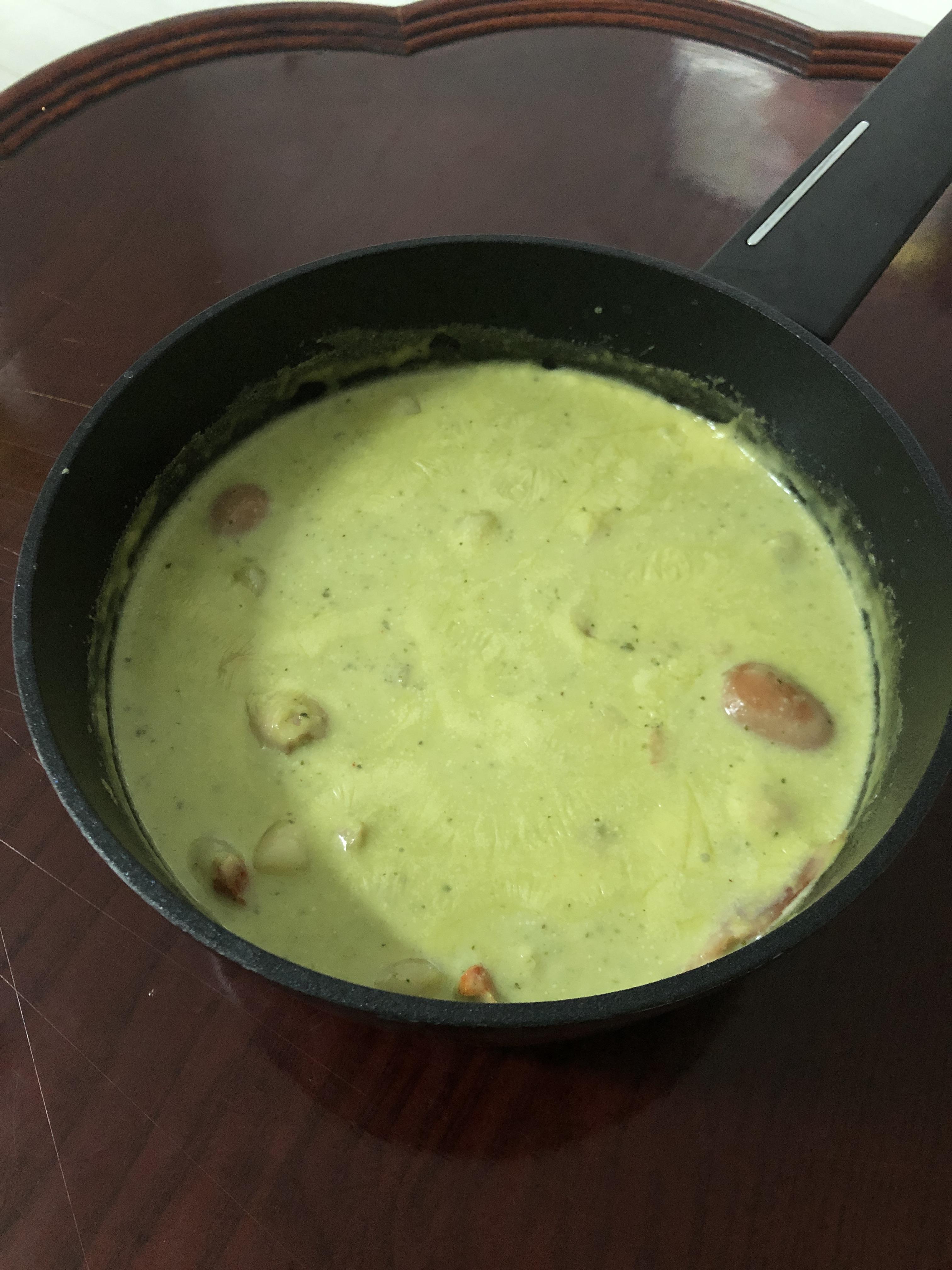바질크림떡볶이에는 새우랑 베이컨, 소시지,