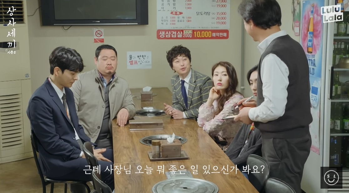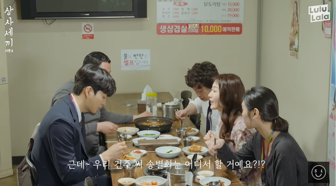 밥 먹으면서 건주 송별회 얘기를 하는 회사 사람들,,