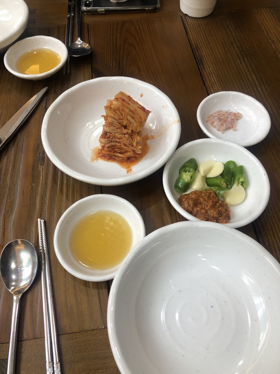 밑반찬으로는 김치랑 쌈장, 고추, 마늘,