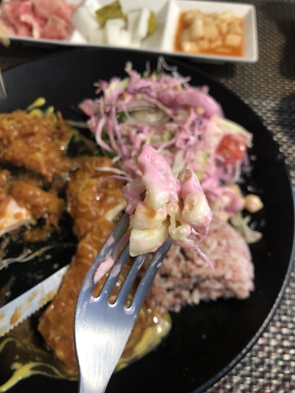 보라빛 샐러드 소스가 알록달록하니