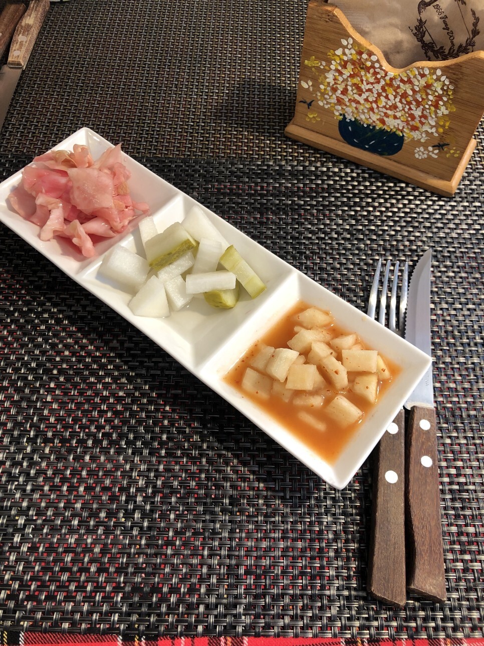 밑반찬으로는 깍두기, 오이피클,