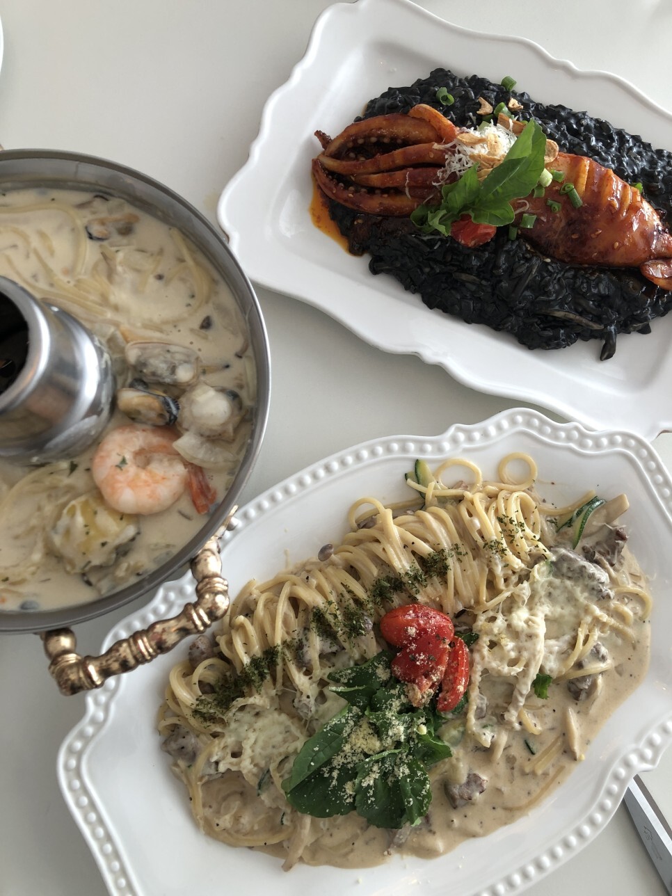 밥은 크림리조또에 오징어먹물 뿌린 듯 하고