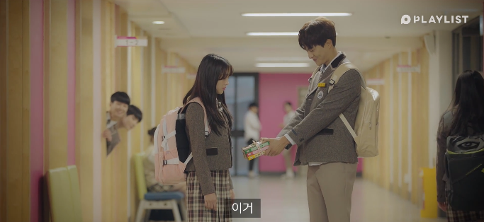 연우가 쭈뼛쭈뼛 우산을 건넵니다.