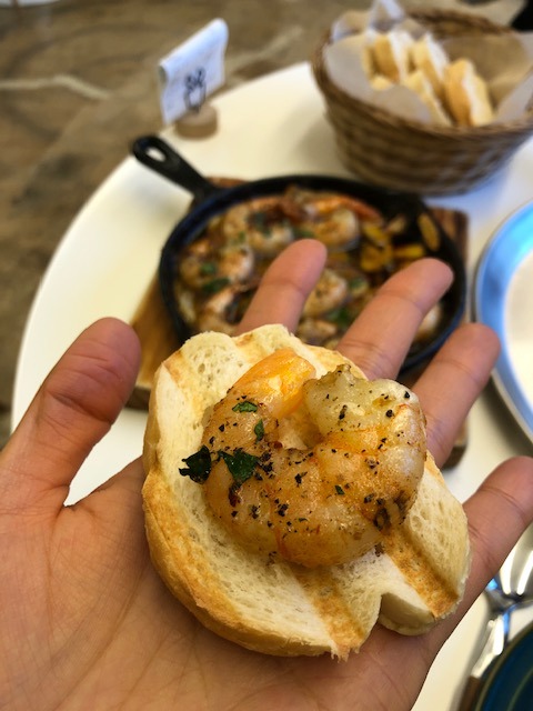 빵에 새우를 올려서 먹으면